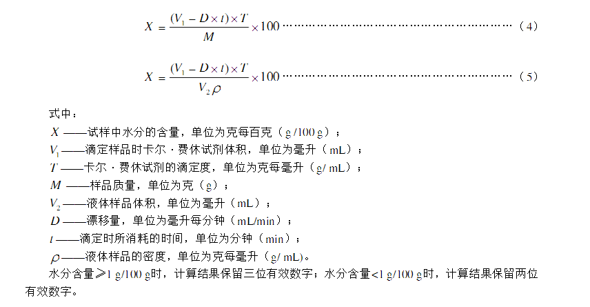固體試樣中水分的含量按式(4),液體試樣中水分的含量按式(5)進行計算。