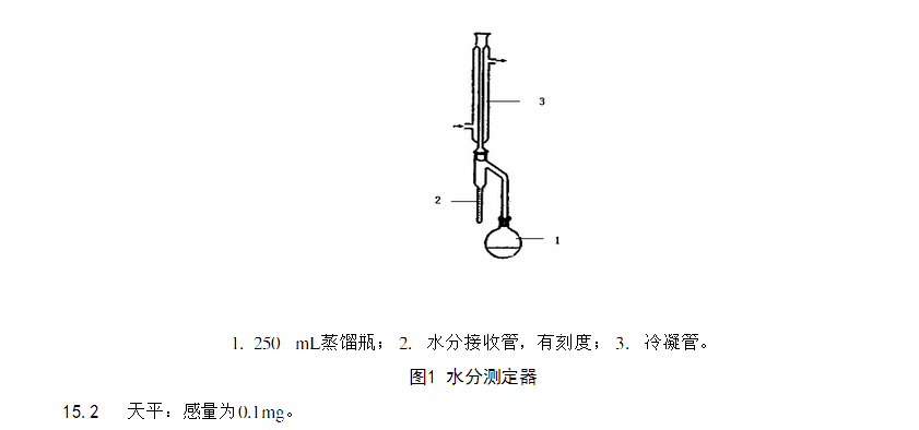 15.1 水分測定器:如圖1所示(帶可調電熱套)。水分接收管容量5 mL,**小刻度值0.1 mL,容量誤差小于0.1 mL。