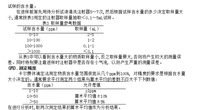 從上所述, 利用卡爾費休滴定法測定物質中水分是一種重要而靈敏的化學分析方法,但除了有一個非常好的測定儀器外,必須對測定的物質中有無干擾物質存在,根據物質中水分的含量確定適當的進樣量,克服各種影響測定精度的因素,細心操作,才能得到好的測定結果。