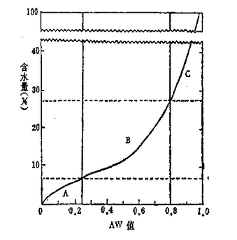 拉布薩(T.P.Labuza)在總結食品的穩定性和Aw之間的相對關系時,闡明了食品水分和間存在有內在的相互關系。并可用等溫吸濕曲線(Water sorption isothermal Curve)來表示。在一定的溫度下,食品由于吸濕或放濕,所得到的水分活度與含水量之間關系的曲線稱為等溫吸濕曲線(圖1-1)。從這個曲線可以看出食品中水分存在的幾種狀態。如果把這個曲線分為三個區段,Aw在0~0.25之間為A區段,水分牢固地與食品中某些成分結在0.25~0.80之間為B在
