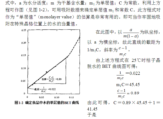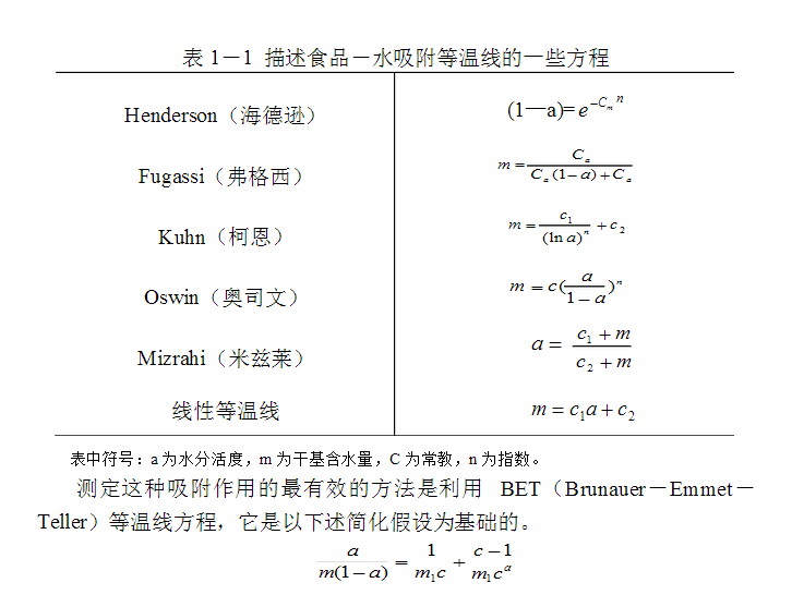 食品的典型吸附等溫線是反S型的,并可近似地由數字關系式表達(見表1-1)。