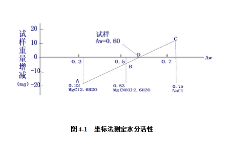 根據試樣與二種以上標準飽和鹽溶液平衡后試樣重量的增減作坐標圖(見圖4-1),縱坐標為試樣重量增減的毫克數,橫坐標為水分活性值。如圖4-1的A點是試樣與標準MgCl26H2O飽和溶液平衡后重量減少20.0毫克,試樣與標準Mg(NO3)26H2O平衡后失重5.2毫克,相應作出B點,與NaCl飽和溶液平衡后試樣增加11.1毫克作出C點,把三點連成一線與橫坐標交于D點,得出試樣的水分活性為0.60。