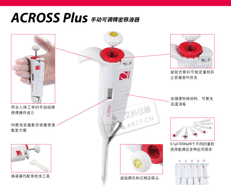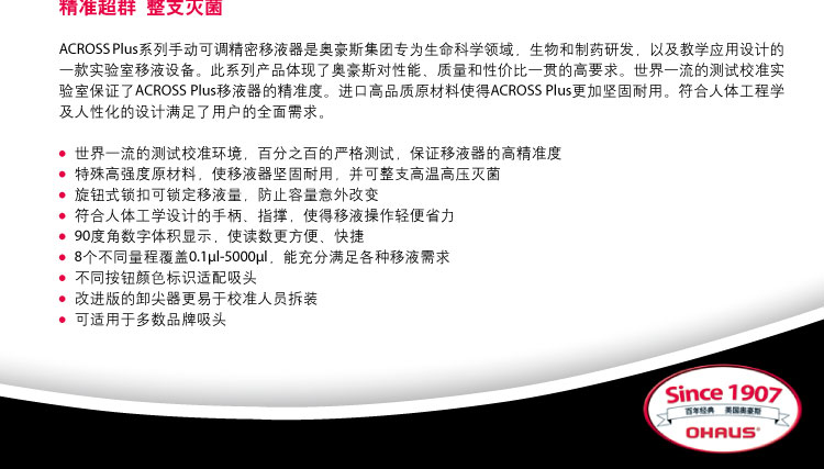 ACROSS Plus系列手動可調精密移液器是奧豪斯集團專為生命科學*域,生物和制藥研發,以及教學應用設計的一款實驗室移液設備。此系列產品體現了奧豪斯對質量,性能和可靠性一貫的高要求。世界一流的測試校準實驗室保證了ACROSS plus出廠時的精準。進口高品質原材料使得ACROSS Plus更加堅固耐用。符合人體工程學及人性化的設計滿足了用戶的全面需求。